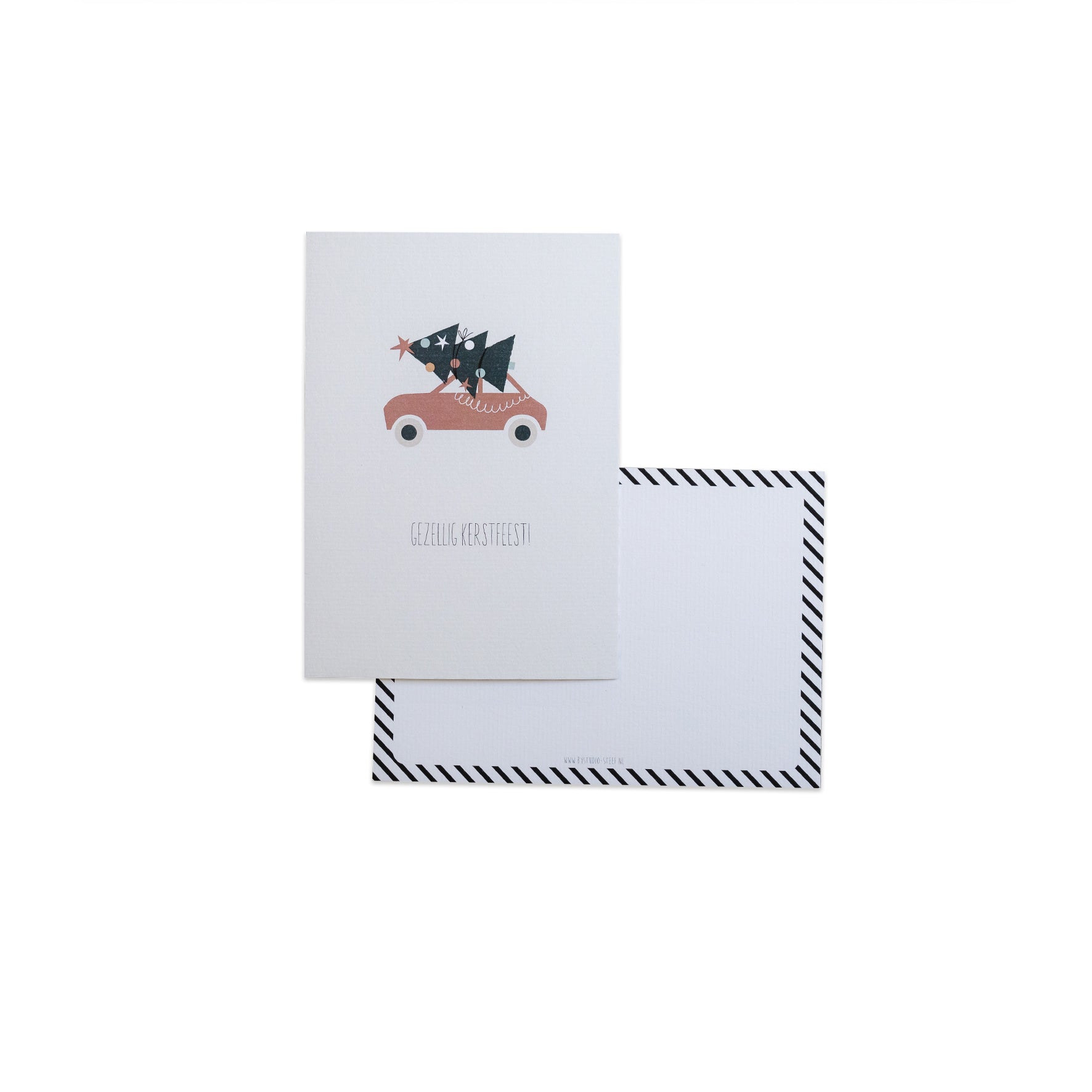 Breng een glimlach in de decembermaand met deze vrolijke kerstkaart met Gezellig Kerstfeest”. Een speelse kaart met een knipoog naar die gezellige rit naar huis met de boom op het dak en de feeststemming al in de lucht.