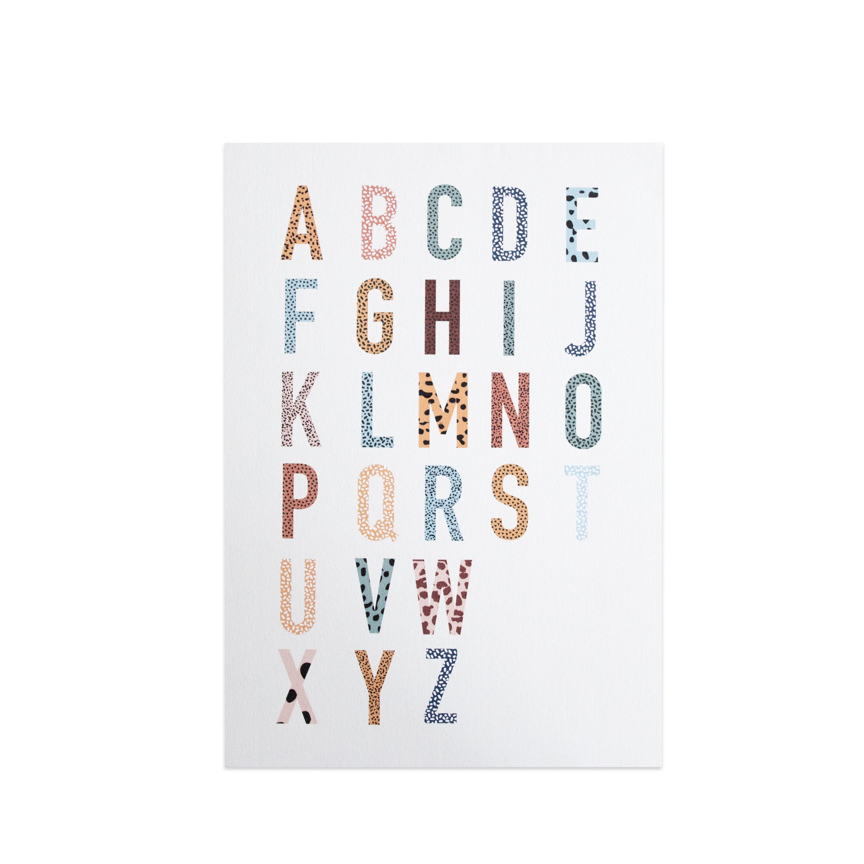 Elke letter van het alfabet is liefdevol ontworpen met vrolijke printjes en speelse kleuren, waardoor de poster niet alleen leerzaam, maar ook een echte blikvanger is.
